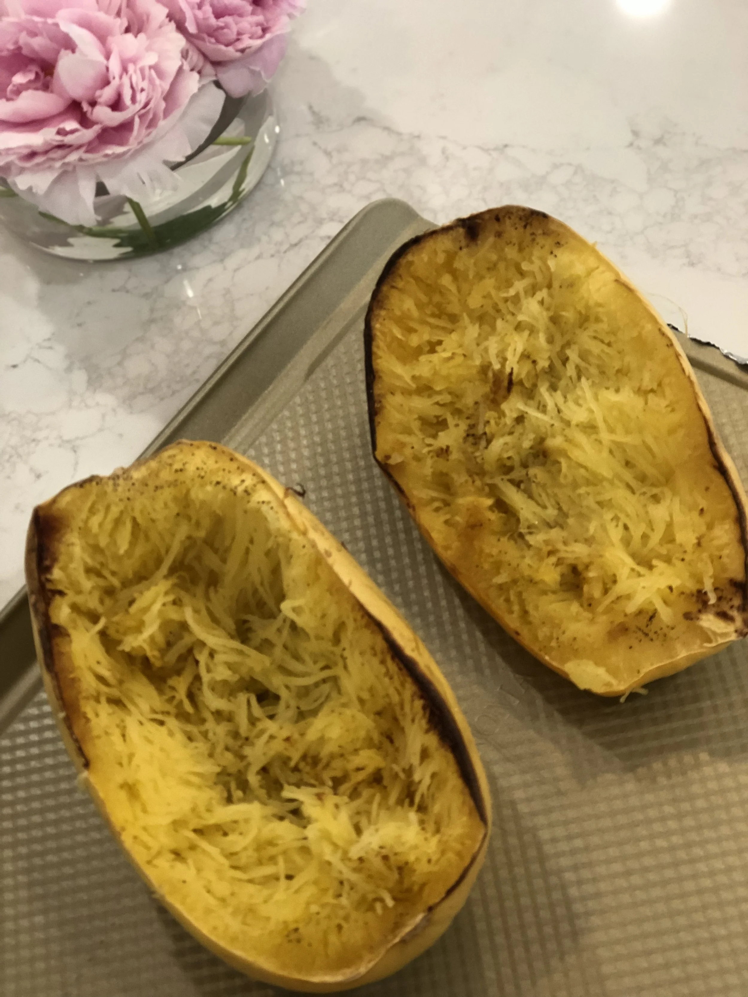 • 1 large spaghetti squash (cut in half, seeds removed)