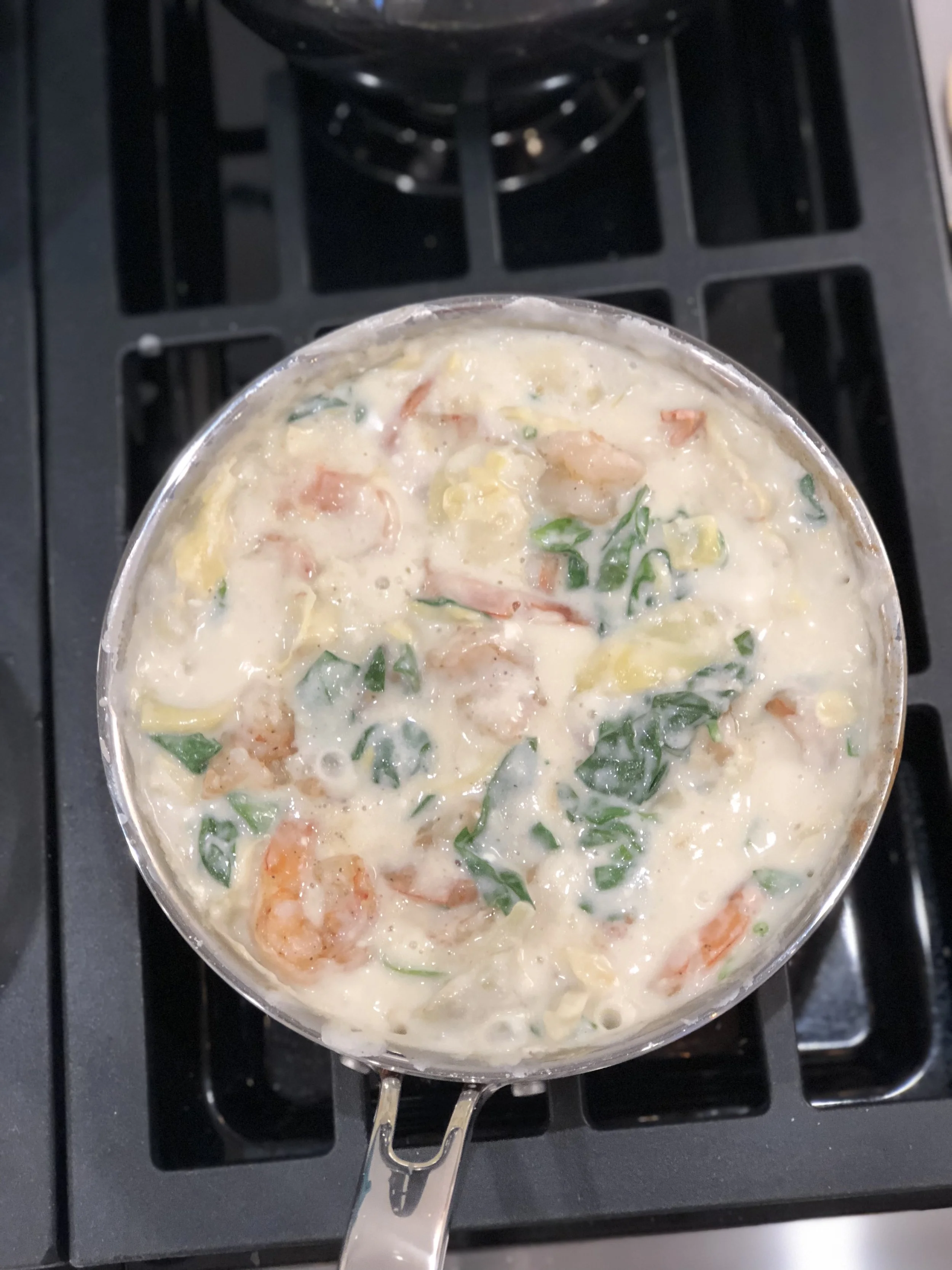Finally, remember those shrimp sitting to the side?  It's time to add those back into the pan and stir into the spinach artichoke mixture.  Heat for about 3-5 more minutes on medium heat stirring constantly.....you don't want your shrimp to get too tough from overcooking. This is also a good time to give your sauce a taste to see if it needs any salt/pepper and add those accordingly.