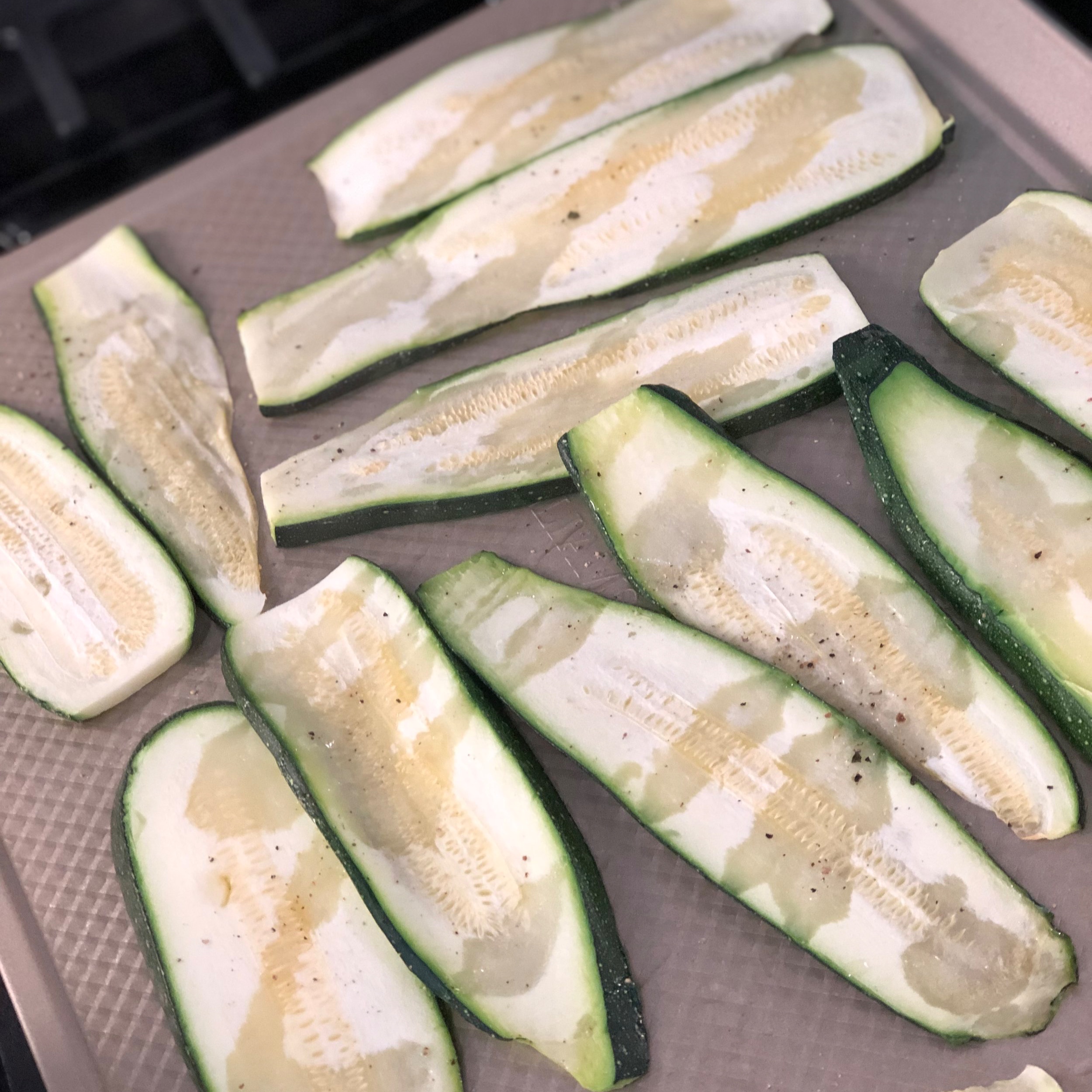 Preheat oven to 375 and slice the zucchini thin (about 1/8 inch). Drizzle with olive oil and bake for 15 minutes or until soft and pliable - you want to be able to roll them without breaking.