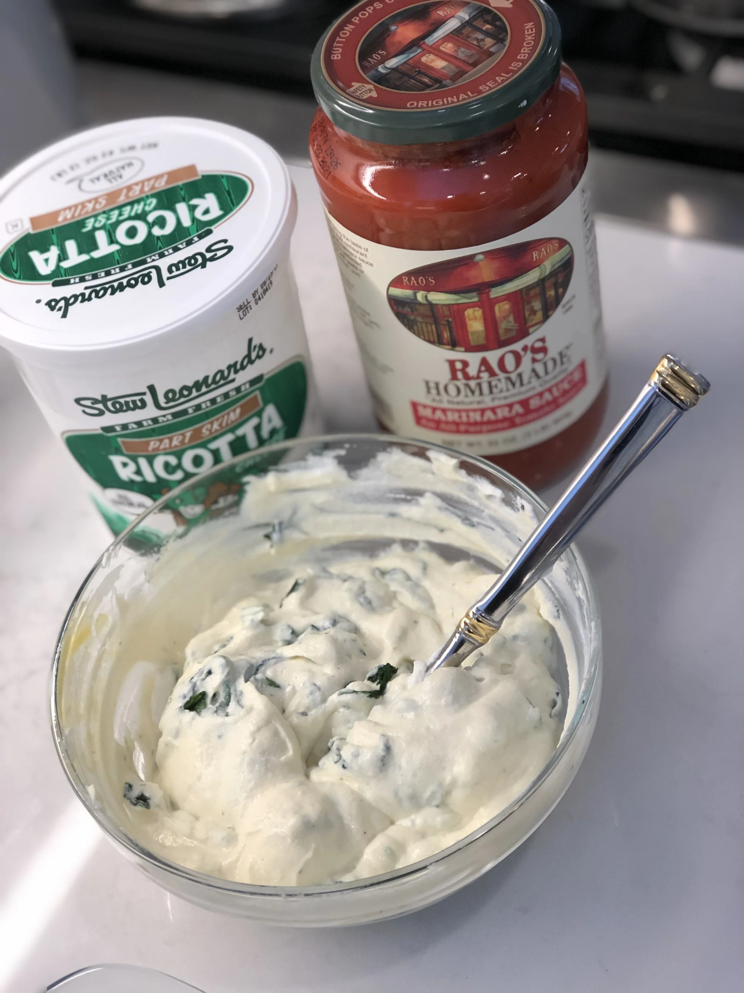 Add in the chopped spinach to the ricotta mixture. Check your zucchini and remove from oven when finished. Then grab your favorite tomato sauce!