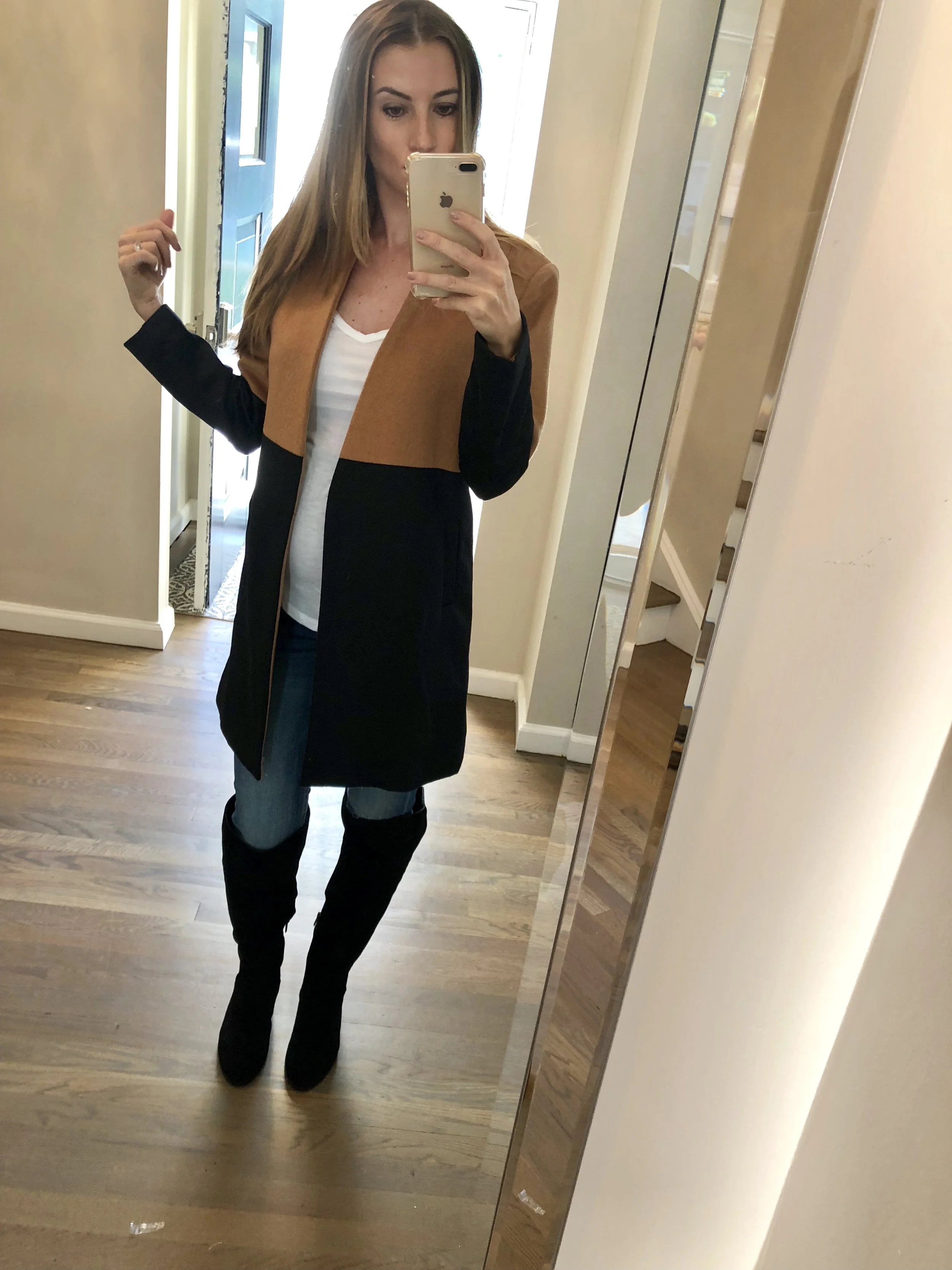 Starting off with my FAVORITE look from this sale! This Color Block Coat is to die for and it comes in this camel/black color and also a navy/burgundy combo, also only $84.90! I'm wearing an XS.. I've paired it with a skinny jean and white tee (featured below) and these Vince Camuto over the knee boots in black (also available in grey and taupe).  These boots run true to size, I'm wearing an 8.5 and they also don't fall down your leg if you have twig legs like me...but they aren't a tight zipper fit either.  Basically, they're perfect!