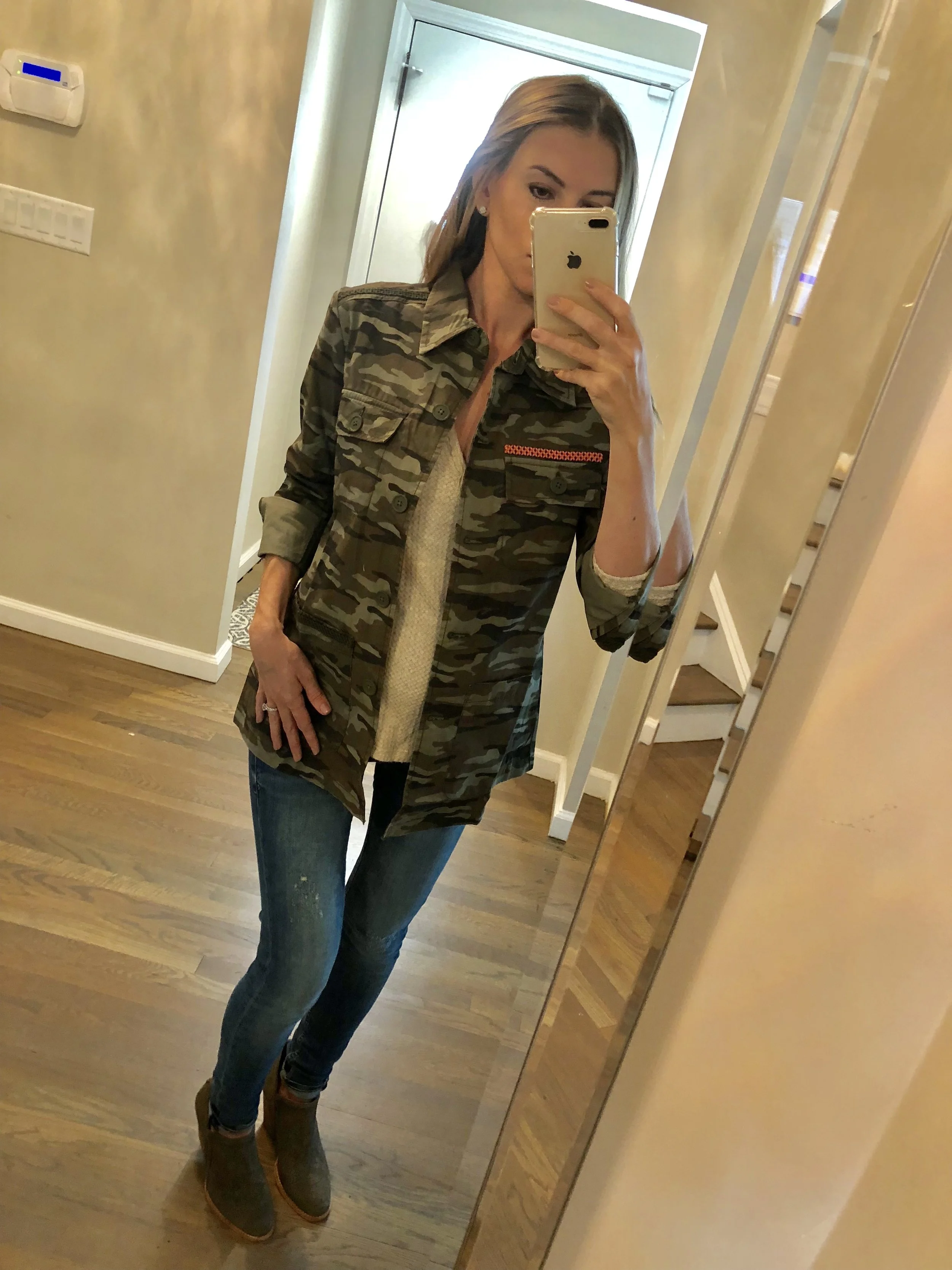 Next up is this perfect Camo Print Utility Jacket.  I love the pink detail and that it's lightweight and a little longer because let's be honest, we don't always want the cropped look on those bloated days (or when your 8 months pregnant).   It's also under $50 and comes in this style and a plain green if camo isn't your thing.  I've paired it with the Henley above and  these Jeffrey Campbell booties which are just perfect and true to size (I'm wearing an 8.5).  The booties are limited in size as of right now, so here is a perfect alternative (and cheaper option) in a bunch of colors and sizes!